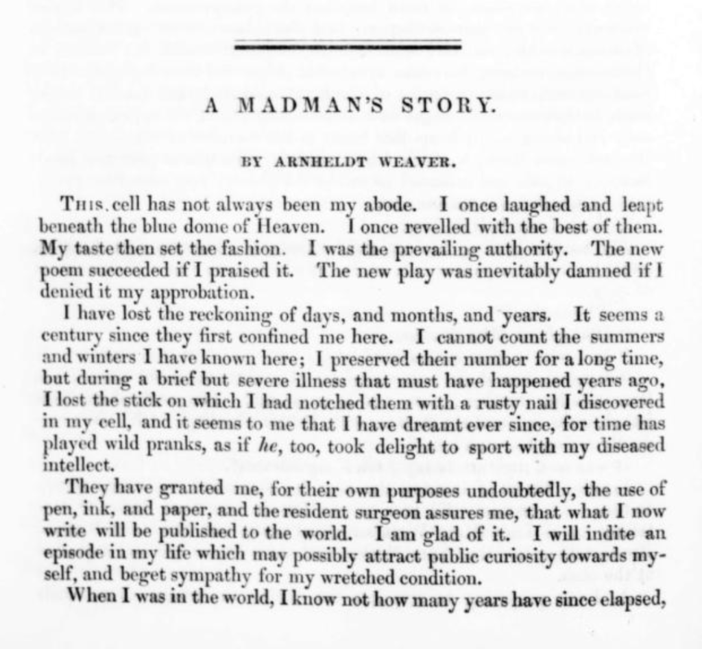 They have granted me, for their own purposes undoubtedly, the use of pen, ink, and paper, and the resident surgeon assures me, that what I now write will be published to the world. I am glad of it. I will indite an episode in my life which may possibly attract public curiosity towards myself, and beget sympathy for my wretched condition.