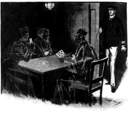 “‘Aye, that’s it,’ agreed the other; while the Chinaman rocked backwards and forwards and peered at me. ‘Look ye here, mister; you think you’re master of this ship, I reckon. So did others afore ye. But that is where you are all mistaken. There is only one skipper aboard this craft, and that is me! And I am going to have my way. This ship’—the thing that was speaking thumped the table furiously till the bottles rang—’has got to be lost—to go to the bottom. Do you understand? Maybe you have a kind of objection to sinking her. So did some of the others in your shoes; and those are the lucky ones that shifted quietly, I can tell ye. But I’ll make a sportsmanlike offer. We’ll play for it. The ship’s safety shall be the stake; that is a fair game, ain’t it? If we wins the rubber, you sinks the ship. If you and Nell there’—with a ghastly leer—’beats us, then the old tub floats. See? Play up, Ah Fung, you son of a pig—your lead!’