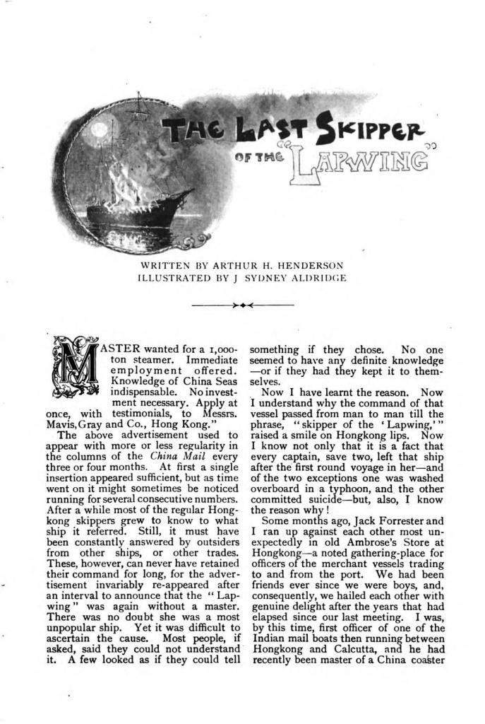 The above advertisement used to appear with more or less regularity in the columns of the China Mail every three or four months. At first a single insertion appeared sufficient, but as time went on it might sometimes be noticed running for several consecutive numbers. After a while most of the regular Hong Kong skippers grew to know to what ship it referred. Still, it must have been constantly answered by outsiders from other ships, or other trades. These, however, can never have retained their command for long, for the advertisement invariably re-appeared after an interval to announce that the “Lapwing” was again without a master. There was no doubt she was a most unpopular ship. Yet it was difficult to ascertain the cause. Most people, if asked, said they could not understand it. A few looked as if they could tell something if they chose. No one seemed to have any definite knowledge—or if they had they kept it to themselves.