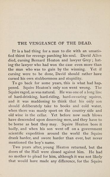 To go back for some years, this is what had happened. Squire Heaton’s only son went wrong. The Squire raged, as was natural. He was one of a long line of hard-drinking, hard-riding, hard-swearing squires, and it was maddening to think that his only son should deliberately take to books and cold water, when there was manly sport on the country side and old wine in the cellar. Yet before now such blows have descended upon deserving men, and they have to be borne as best they may. Squire Heaton bore it badly, and when his son went off on a government scientific expedition around the world the Squire drank harder, and swore harder than ever, but never mentioned the boy’s name.