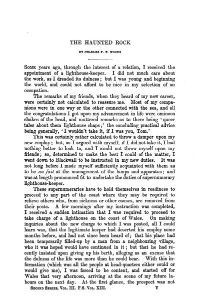 Some years ago, through the interest of a relation, I received the appointment of a lighthouse-keeper. I did not much care about the work, as I dreaded its dulness; but I was young and beginning the world, and could not afford to be nice in my selection of an occupation.