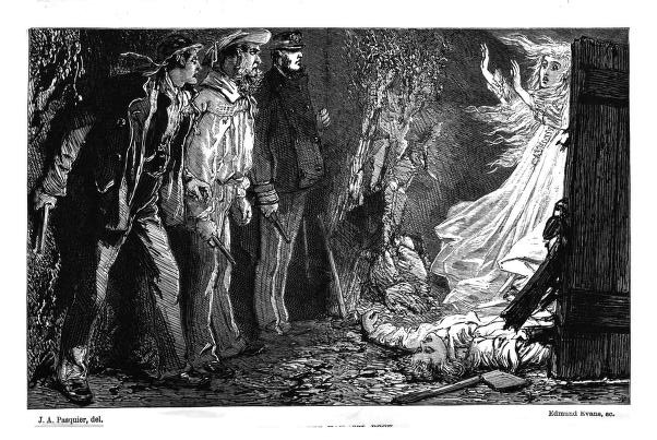 Suddenly, before our very faces, the door which we had fastened so carefully flew open, and the step went by us as we crouched back almost into the very wall. The struggling now sounded up in the watch-room, and then again seemed coming nearer to us, step by step, as if a heavy body was being lifted down the stair. I glanced at my companions; they were both ashy pale, but seemed calm and resolute. The steps came nearer, nearer, and again passed into the cellar; and again the wild cry of ‘George, George! for God’s sake don’t murder me!’ rang out close by; and as the words died away, a vision appeared before us, the horror of which, even at this lapse of time, makes me shut my eyes in dread. By the light of a pale lambent flame that seemed to spring from every part of the cellar, we saw the dead body of a man lying on the ground, the face and head so battered and covered with blood as to make the features undistinguishable. Over it stood a woman in her night-dress, her arms extended as if to ward off a blow, while from a gaping wound in her throat the blood poured down in torrents. I remember the agonised entreaty visible in the large blue eyes, and the rippling masses of golden hair contrasting strongly with the blood-covered bosom—but no more; for I fell insensible. When I came to, I found myself in bed, and so deplorably weak that I could barely turn round. I had been nearly dying, it afterwards turned out, from an attack of brain-fever, brought on, the doctor said, by over-mental excitement.