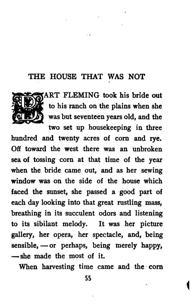 Bart Fleming took his bride out to his ranch on the plains when she was but seventeen years old, and the two set up housekeeping in three hundred and twenty acres of corn and rye. Off toward the west there was an unbroken sea of tossing corn at that time of the year when the bride came out, and as her sewing window was on the side of the house which faced the sunset, she passed a good part of each day looking into that great rustling mass, breathing in its succulent odors and listening to its sibilant melody. It was her picture gallery, her opera, her spectacle, and, being sensible,—or perhaps, being merely happy,—she made the most of it.